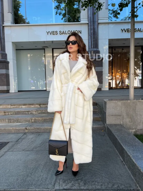 Белая норковая шуба с поясом - в аукционной норке 100266