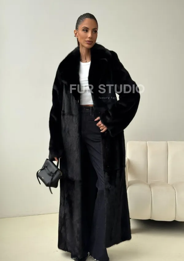 Мех данной шубы аукционная норка , цвет черный. Предлагается в размерах от 42 до 50. Длина модели 125-130 см, что выгодно подчеркивает фигуру девушек. Эта модель идеально подойдет для девушек и женщин, предпочитающих роскошные натуральные меха.
