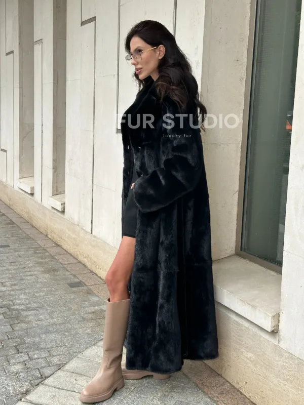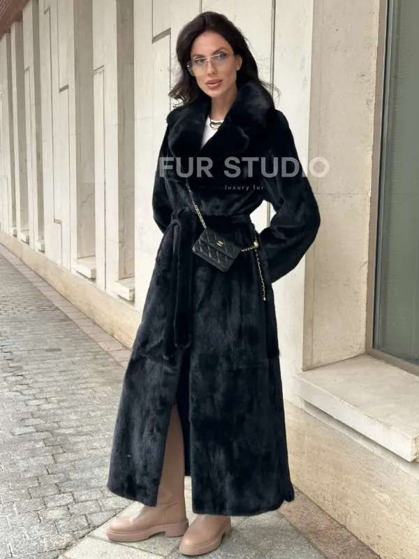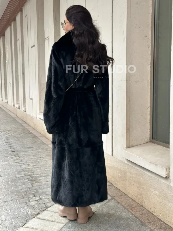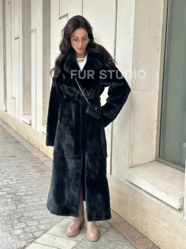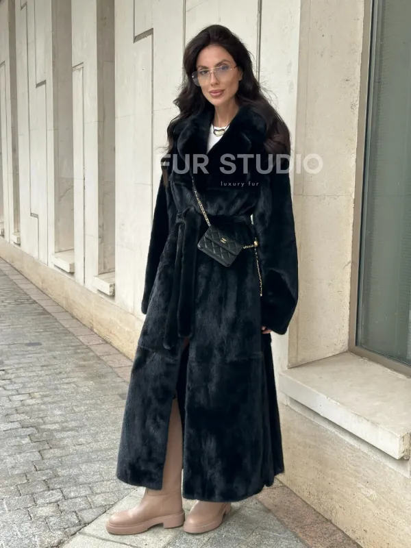 Черная норковая шуба NAFA MINK с поясом в пол 100933