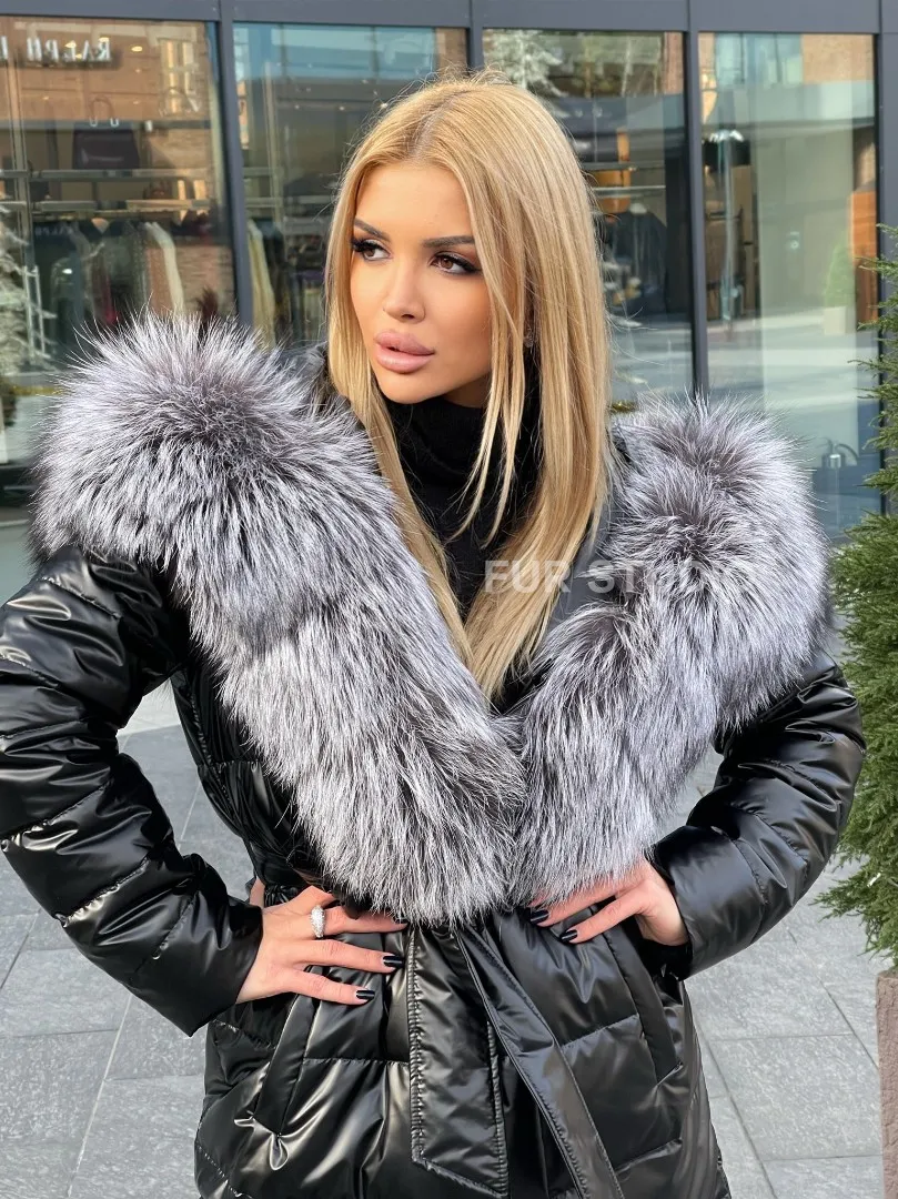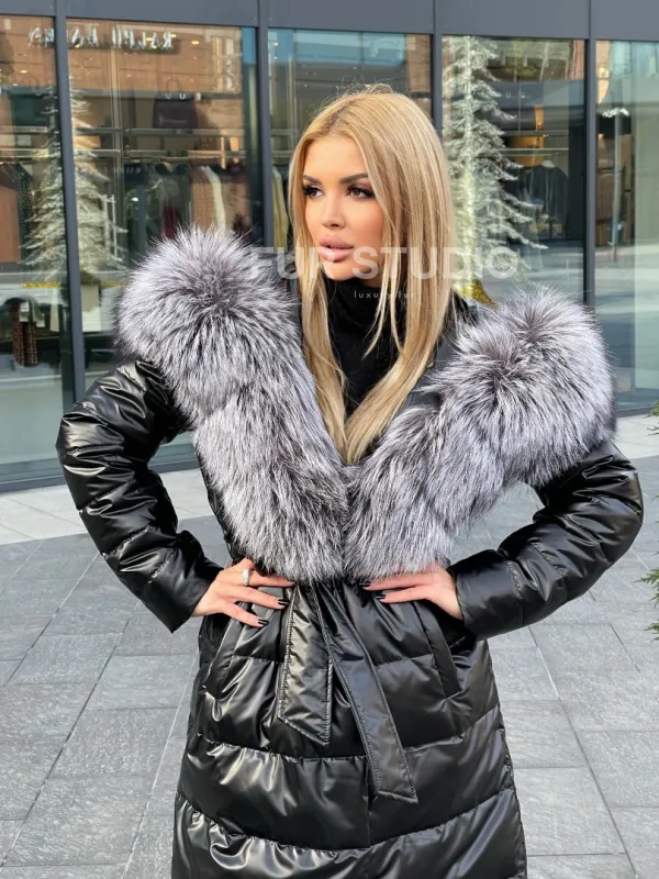 Чёрное пуховое пальто с меховым капюшоном 100223