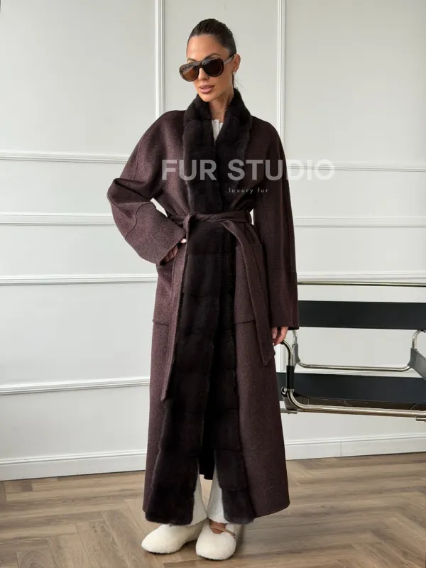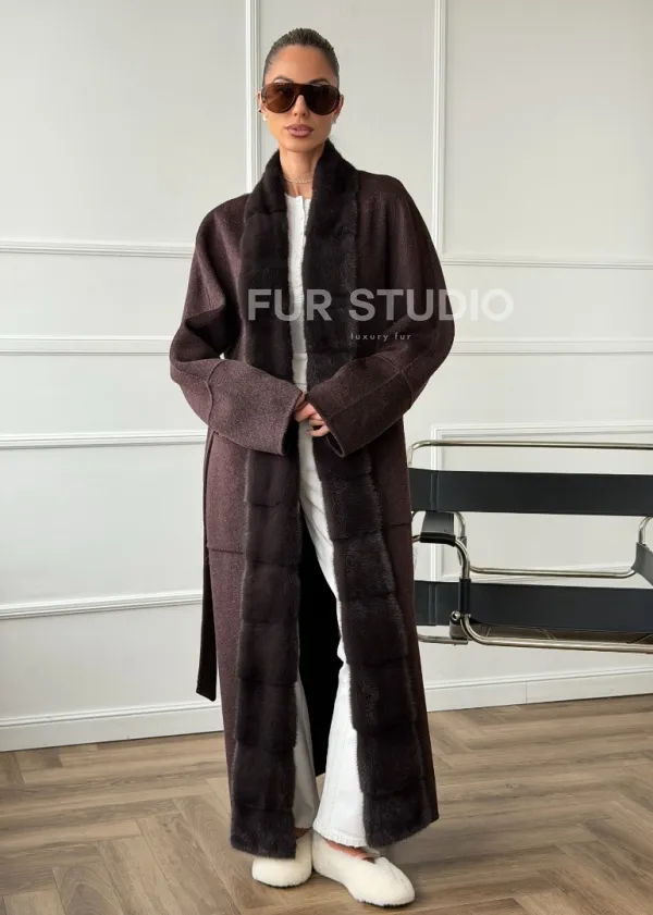 Длинное демисезонное пальто с мехом норки 102673