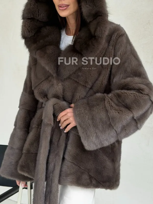 Меховой норковый полушубок с капюшоном куница 102689