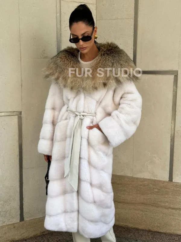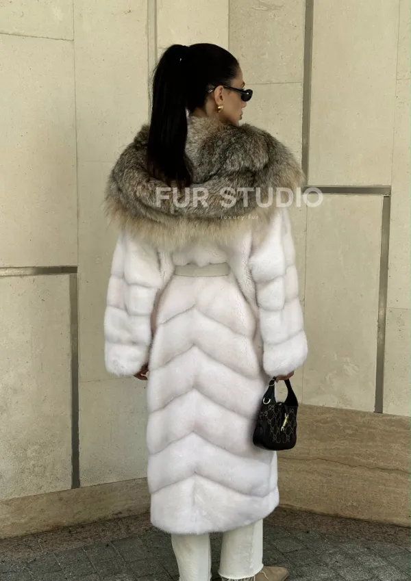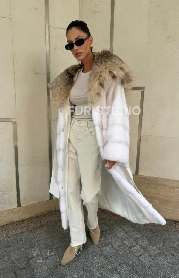 Мех данной шубы аукционная норка, цвет белый. Предлагается в размерах от 42 до 54. Длина модели 115-120 см, что выгодно подчеркивает фигуру девушек. Эта модель идеально подойдет для девушек и женщин, предпочитающих роскошные натуральные меха.
