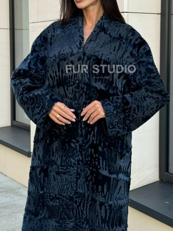 Пальто из меха каракуля с V-образным воротником, цвет Indigo Blue 101118