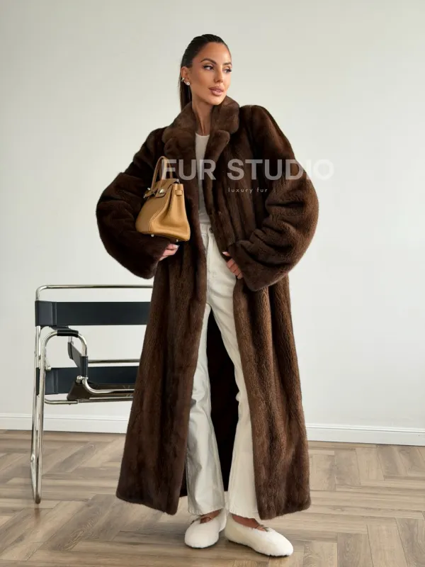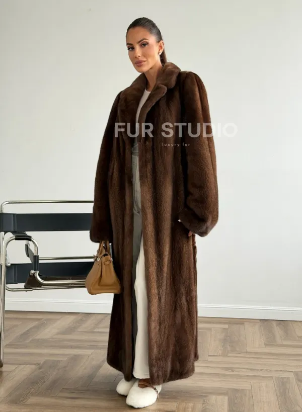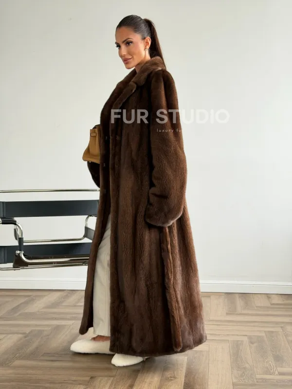 Мех данной шубы аукционная норка , цвет коричневый. Предлагается в размерах от 42 до 48. Длина модели 125-130 см, что выгодно подчеркивает фигуру девушек. Эта модель идеально подойдет для девушек и женщин, предпочитающих роскошные натуральные меха.